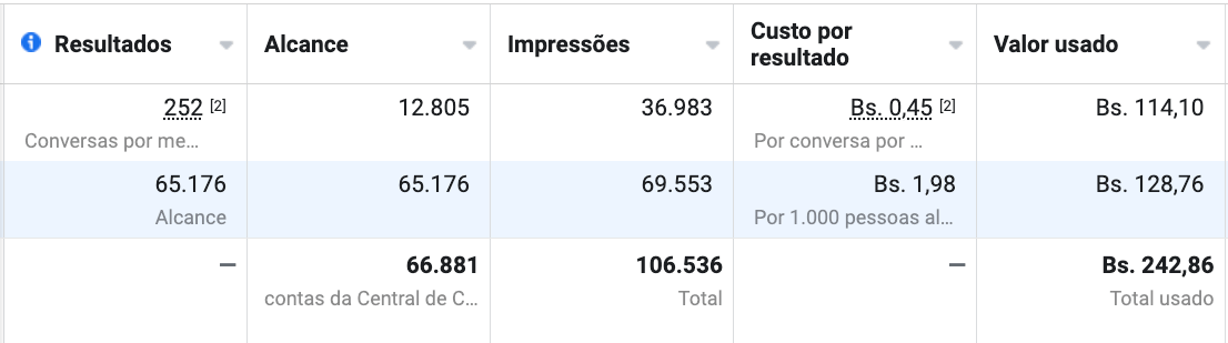 Se realizaron 2 campañas paralelas, una para difundir a la mayor cantidad de personas que la Dra (Dermatóloga) se encontraba en la ciudad por poco tiempo, llegando a 65176 personas y otra campaña que enviaba a los pacientes potenciales al Whatsapp de la Dra, recibiendo 252 mensajes en este periodo de 7 días. Durante estos 7 días se logró llenar la agenda de la Dra para las 3 semanas siguientes, que era el tiempo de permanencia de la Dra en la ciudad. En estas 3 semanas se atendió efectivamente a aproximadamente 90 pacientes con una inversión de 243 Bs.